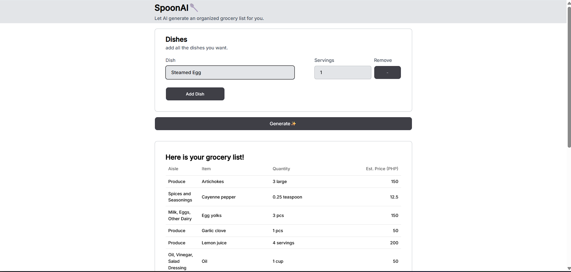 SpoonAI✨ is a web application that allows users to fetch ingredients and their estimated prices based on various dishes. Utilizing the Spoonacular API, it provides a seamless experience for meal planning and grocery list management.